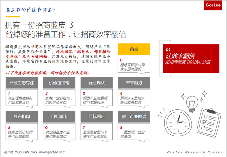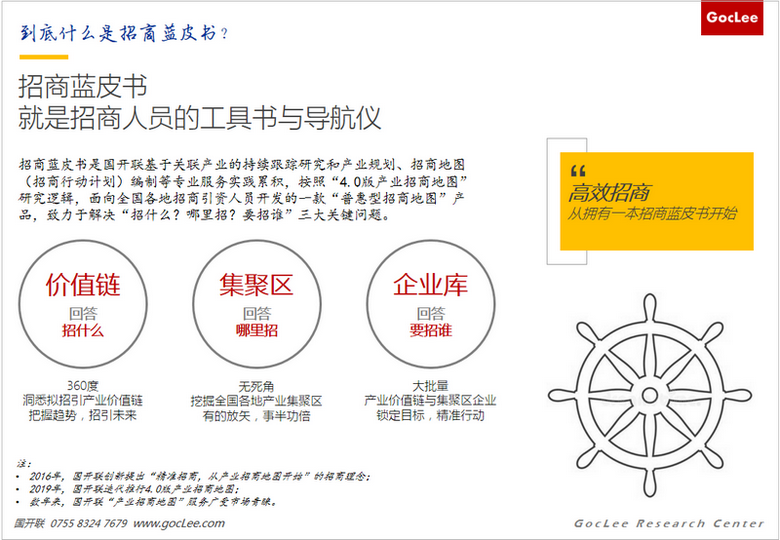 國開聯(lián)有關(guān)負(fù)責(zé)人介紹稱:招商藍(lán)皮書從招商人員實(shí)際工作需求出發(fā),圍繞產(chǎn)業(yè)“價(jià)值鏈”、“集聚區(qū)”和“企業(yè)庫”,重點(diǎn)回答“招什么?”、“到哪招?”和“要招誰”三大關(guān)鍵問題,內(nèi)容涉及九大板塊,清晰呈現(xiàn)產(chǎn)業(yè)全景生態(tài),為招商人員省掉專業(yè)招商的準(zhǔn)備工作,讓招商人員的招商效率翻倍。