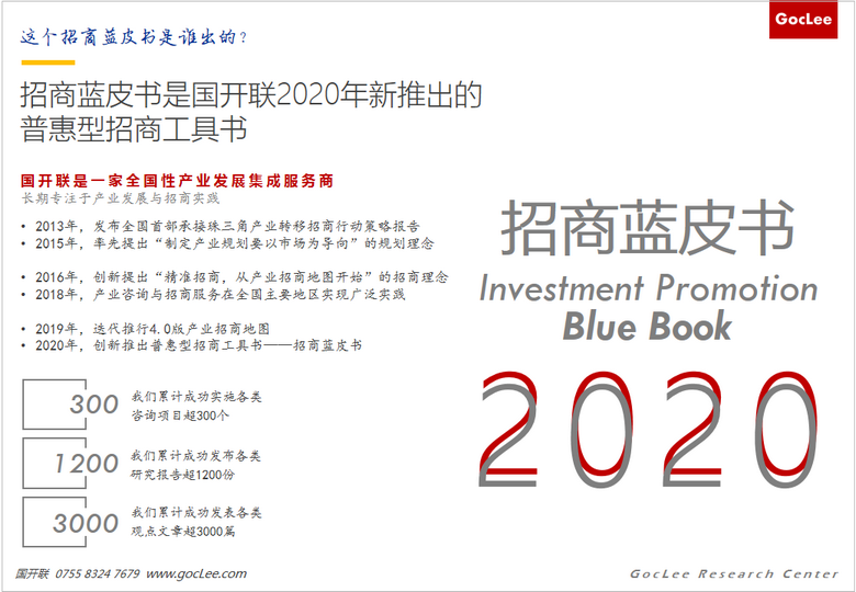 為了更便捷、更廣泛的服務(wù)于全國各地客戶,依托自身產(chǎn)業(yè)持續(xù)跟蹤研究的積累和“4.0版產(chǎn)業(yè)招商地圖”應(yīng)用實(shí)際,國開聯(lián)于2020年初首創(chuàng)推出普惠型招商地圖產(chǎn)品——招商藍(lán)皮書。