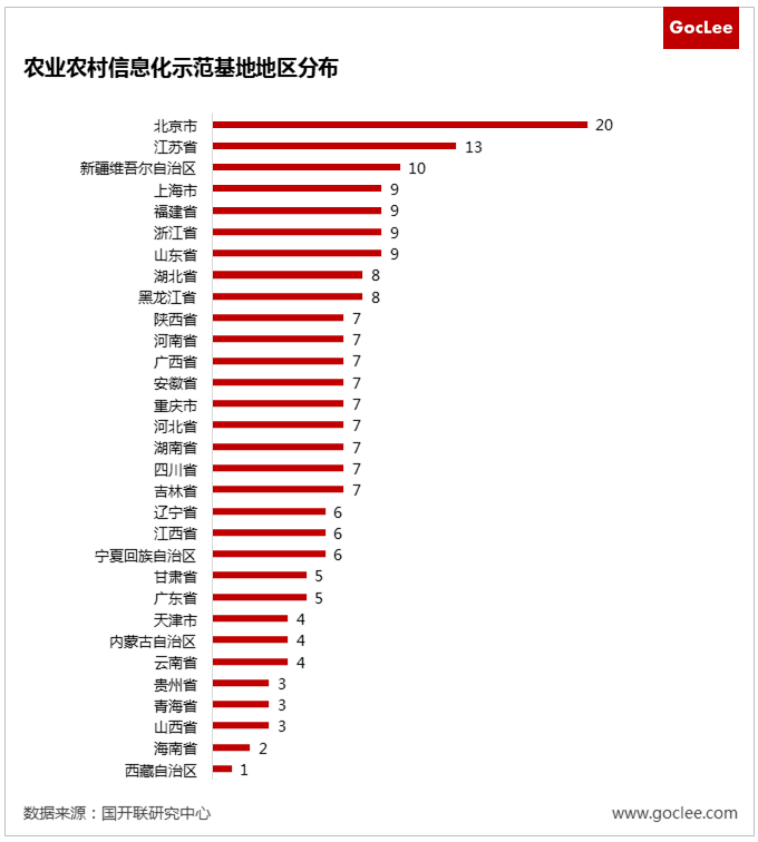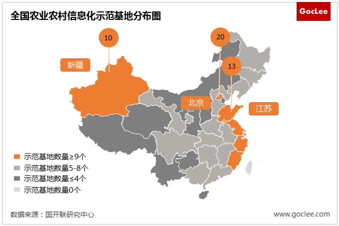 示范基地認(rèn)定于2013年首次開啟,每年認(rèn)定數(shù)量不斷增加。根據(jù)國開聯(lián)《農(nóng)業(yè)農(nóng)村信息化示范基地發(fā)展報(bào)告2021》數(shù)據(jù)顯示,2013年、2015年、2017年分別認(rèn)定40、66、104個(gè)。北京憑借技術(shù)優(yōu)勢擁有最多的示范基地,新疆依托產(chǎn)業(yè)應(yīng)用優(yōu)勢擁有西部地區(qū)最多的示范基地。