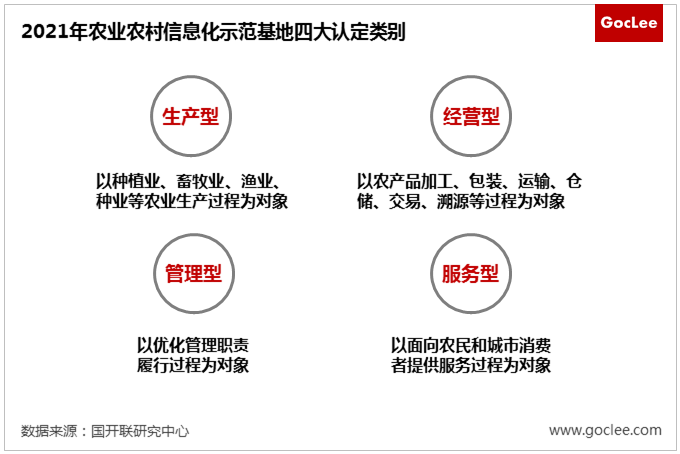 其中,在示范基地的認(rèn)定類別方面做出了較大的修訂。2021年農(nóng)業(yè)農(nóng)村信息化示范基地認(rèn)定辦法將類別調(diào)整為“生產(chǎn)型、經(jīng)營型、管理型、服務(wù)型” 四大類別。