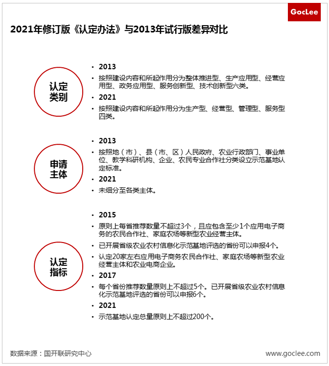 早在2013年,農(nóng)業(yè)部制定了《全國農(nóng)業(yè)農(nóng)村信息化示范基地認(rèn)定辦法(試行)》(農(nóng)市發(fā)〔2013〕1號),對農(nóng)業(yè)農(nóng)村信息化示范基地的申報(bào)條件提出了一系列標(biāo)準(zhǔn)。根據(jù)國開聯(lián)《農(nóng)業(yè)農(nóng)村信息化示范基地發(fā)展報(bào)告2021》,2021年修訂版的認(rèn)定辦法分別在示范基地認(rèn)定類別、申請主體分類、認(rèn)定指標(biāo)三處進(jìn)行了調(diào)整。
