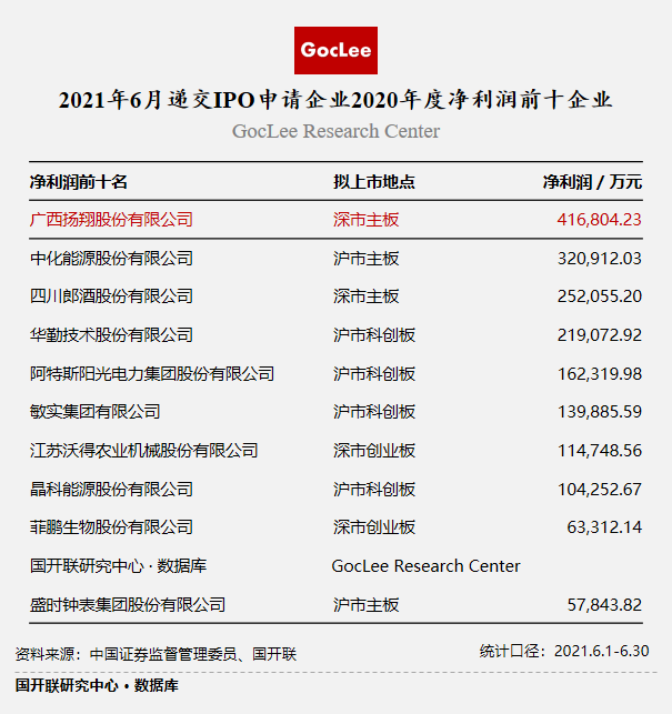 從凈利潤(rùn)來(lái)看,6月遞交申請(qǐng)IPO企業(yè)中,有8家企業(yè)凈利潤(rùn)突破10億元,其中廣西揚(yáng)翔股份有限公司凈利潤(rùn)為416,804.23萬(wàn)元,凈利潤(rùn)收入位居首位。