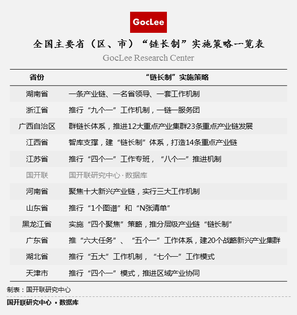 鏈長制被譽(yù)為中國地方政府提升經(jīng)濟(jì)治理能力的創(chuàng)新探索,始于湖南湘潭,2018年,浙江成為全國首個從省級層面推行鏈長制的省份。2020年5月14日召開的中共中央政治局常務(wù)委員會會議指出,要實(shí)施產(chǎn)業(yè)基礎(chǔ)再造和產(chǎn)業(yè)鏈提升工程,鞏固傳統(tǒng)產(chǎn)業(yè)優(yōu)勢,強(qiáng)化優(yōu)勢產(chǎn)業(yè)領(lǐng)先地位,抓緊布局戰(zhàn)略性新興產(chǎn)業(yè)、未來產(chǎn)業(yè),提升產(chǎn)業(yè)基礎(chǔ)高級化、產(chǎn)業(yè)鏈現(xiàn)代化水平。此后,越來越多的省市出臺了鏈長制的相關(guān)政策,國開聯(lián)研究中心針對我國已推行鏈長制的省份進(jìn)行了深度的剖析與研究,推出了《中國主要省份“鏈長制”實(shí)施策略報告》 。
