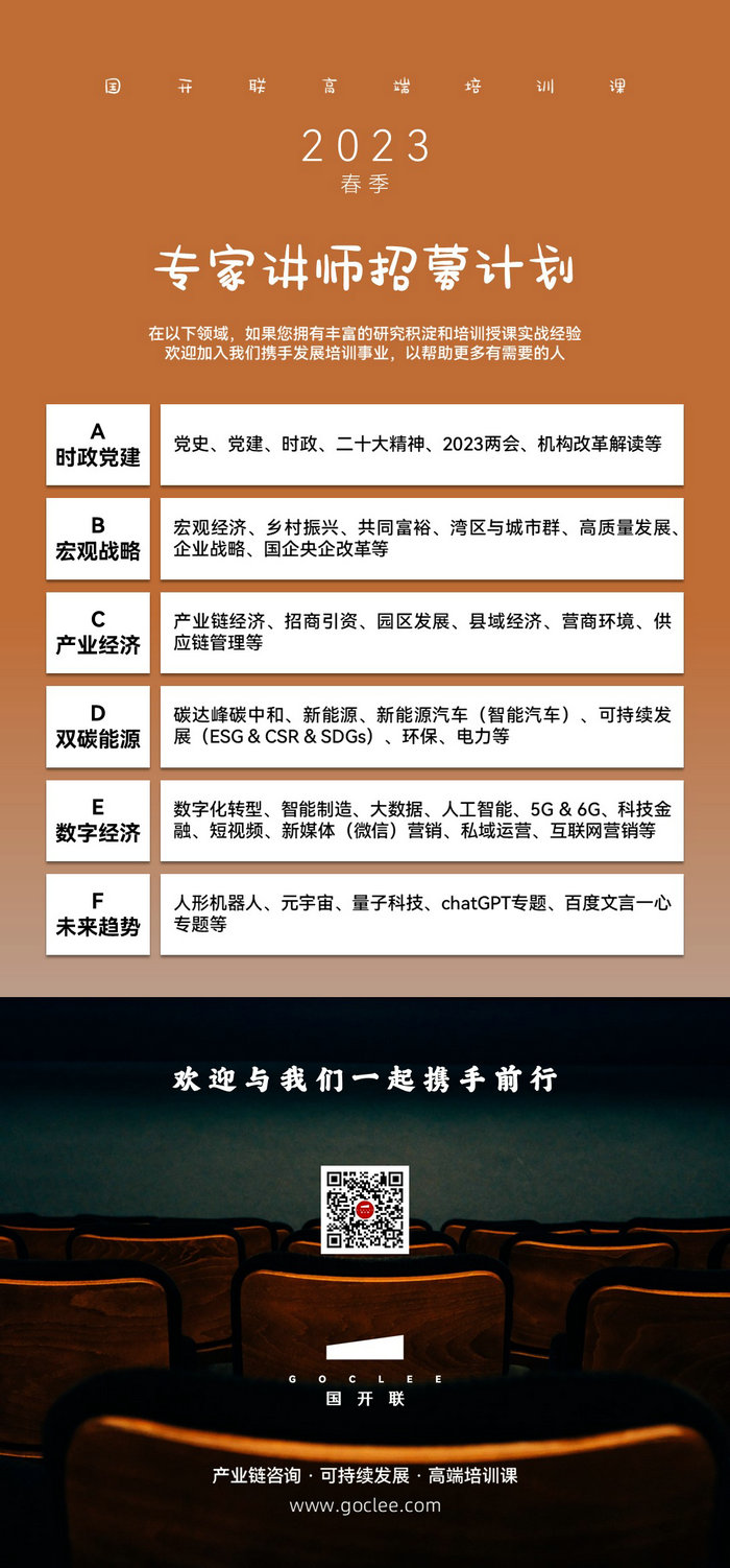 日前,國(guó)開(kāi)聯(lián)發(fā)布《2023年度春季專家培訓(xùn)講師招募計(jì)劃》,涉“黨史黨建、宏觀戰(zhàn)略、產(chǎn)業(yè)經(jīng)濟(jì)、雙碳能源、數(shù)字經(jīng)濟(jì)、未來(lái)趨勢(shì)”等六大領(lǐng)域,涵蓋數(shù)十個(gè)細(xì)分領(lǐng)域。