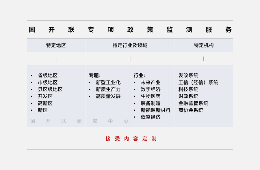 國開聯(lián)“產(chǎn)業(yè)鏈經(jīng)濟政策監(jiān)測”服務(wù)重點由兩部分構(gòu)成,一是標準化服務(wù),即“全國產(chǎn)業(yè)鏈經(jīng)濟政策監(jiān)測月刊”;二是定制化服務(wù),即分地區(qū)、分領(lǐng)域、分機構(gòu)的專項政策監(jiān)測服務(wù)。