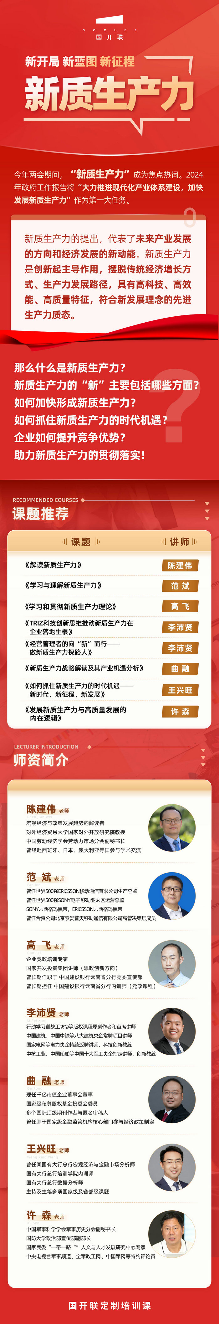 帶著這樣的疑問,國開聯(lián)定制培訓(xùn)課團(tuán)隊(duì)聯(lián)合專家講師共同推出了“新質(zhì)生產(chǎn)力系列培訓(xùn)課程”,旨在探尋大力發(fā)展新質(zhì)生產(chǎn)力形勢下的市場新機(jī)遇和發(fā)展新邏輯。