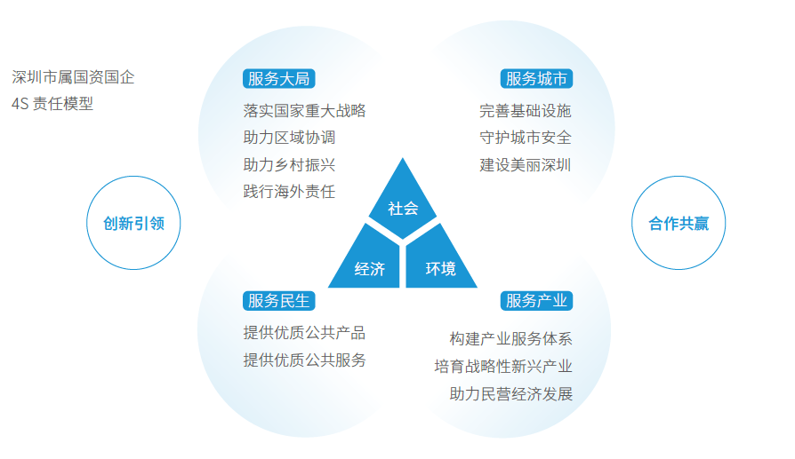 在2023年6月發(fā)布的《深圳市屬國資國企2022社會責(zé)任報告》中,專門呈現(xiàn)了“深圳市屬國資國企4S 責(zé)任模型”,對于全市國資國企履行企業(yè)社會責(zé)任提出了框架模型,是對深圳市屬國資國企履行社會責(zé)任工作的根本性支撐和綱領(lǐng)性指引。