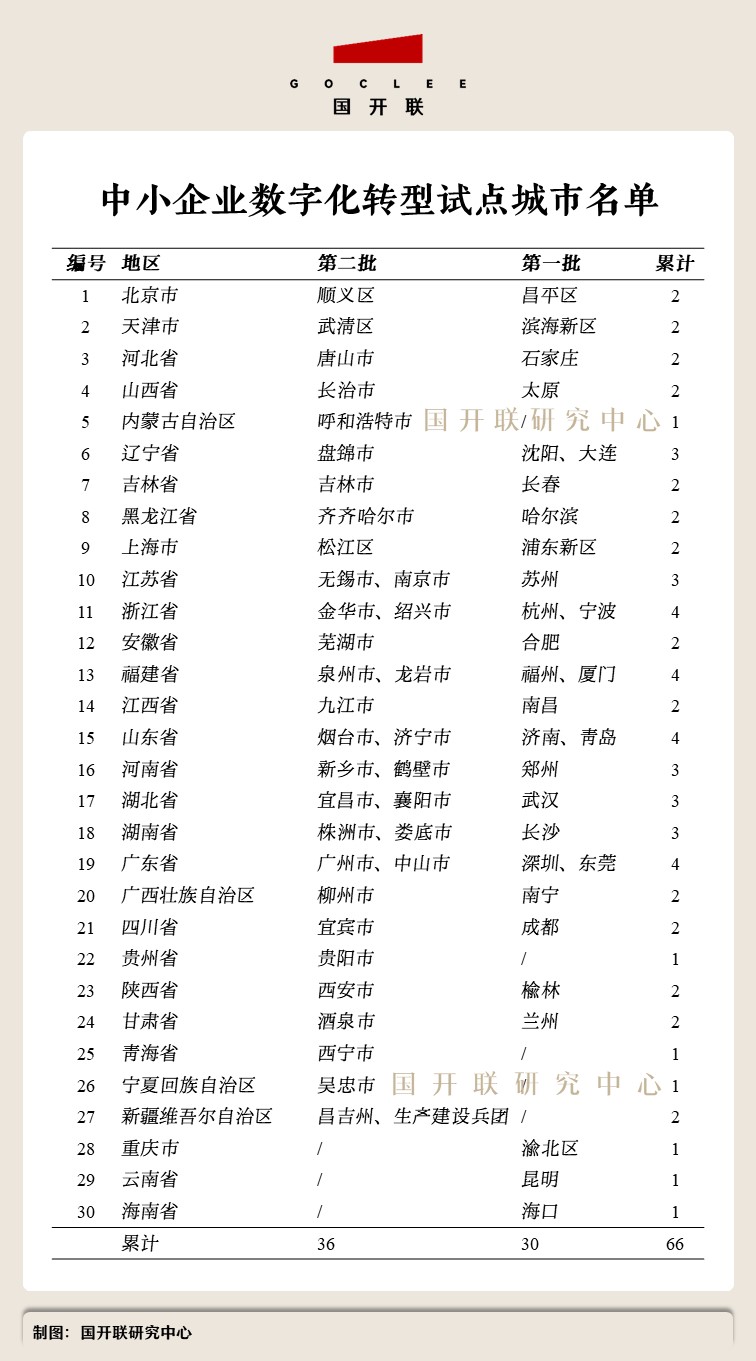 根據(jù)國開聯(lián)數(shù)字經(jīng)濟(jì)研究團(tuán)隊(duì)統(tǒng)計,2023年8月份工業(yè)和信息化部中小企業(yè)局、財政部經(jīng)濟(jì)建設(shè)司發(fā)布“第二批中小企業(yè)數(shù)字化轉(zhuǎn)型試點(diǎn)城市”公示名單,確定首批30個城市被納入試點(diǎn)范圍;此次發(fā)布的公示名單顯示,36個城市被納入試點(diǎn)范圍。如無特殊變化,累計將有66座城市被納入“中小企業(yè)數(shù)字化轉(zhuǎn)型試點(diǎn)范圍”。