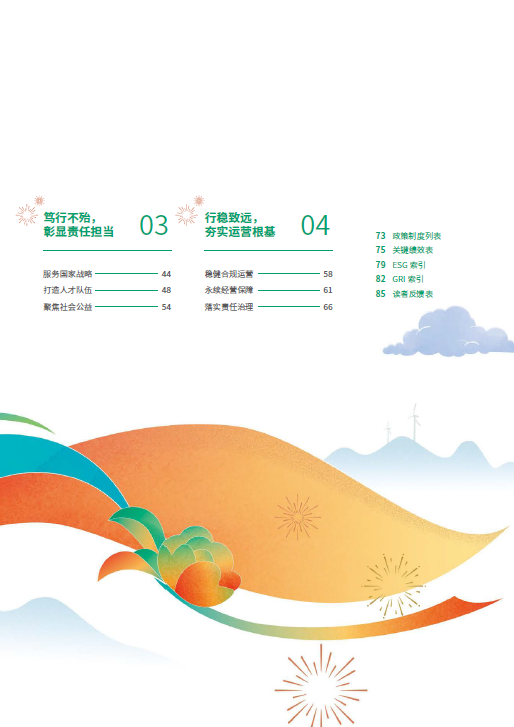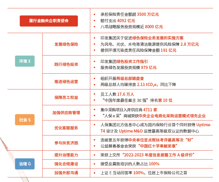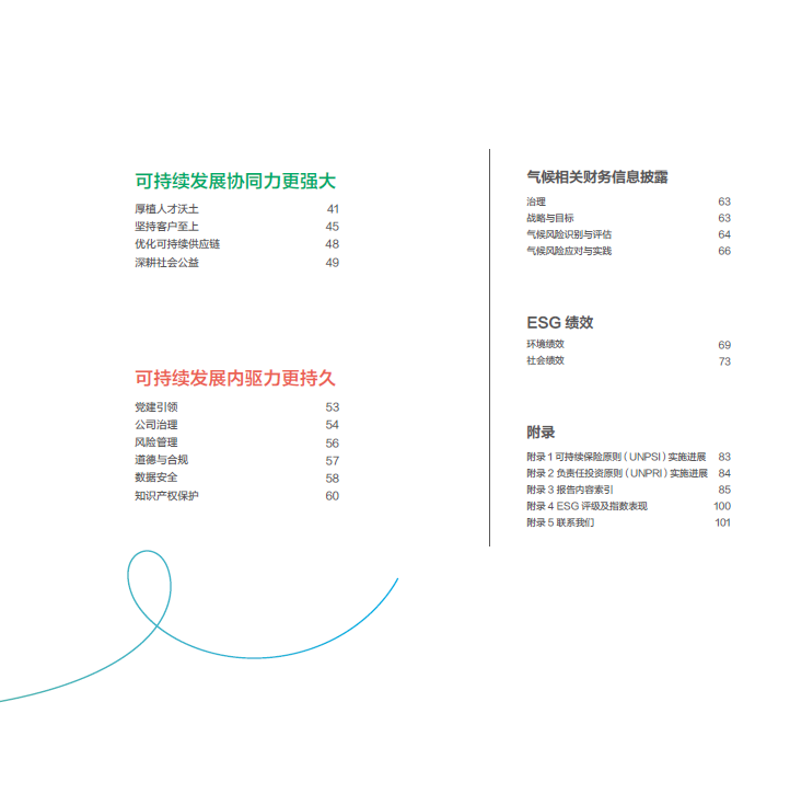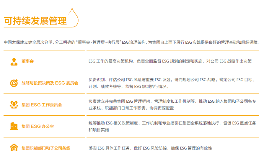 同時,制定《中國太平洋保險(集團(tuán))股份有限公司環(huán)境、社會及治理規(guī)劃》(2023-2025),作為ESG 管理整體框架,持續(xù)細(xì)化ESG四大發(fā)展目標(biāo)和八大實現(xiàn)路徑,搭建ESG 閉環(huán)管理體系,系統(tǒng)性推進(jìn)ESG 管理在各環(huán)節(jié)、各業(yè)務(wù)中的落地執(zhí)行。太保產(chǎn)險、太保壽險制定可持續(xù)/ESG 三年發(fā)展規(guī)劃,資管公司制定綠色金融三年發(fā)展規(guī)劃,不斷完善專業(yè)板塊ESG 工作舉措。