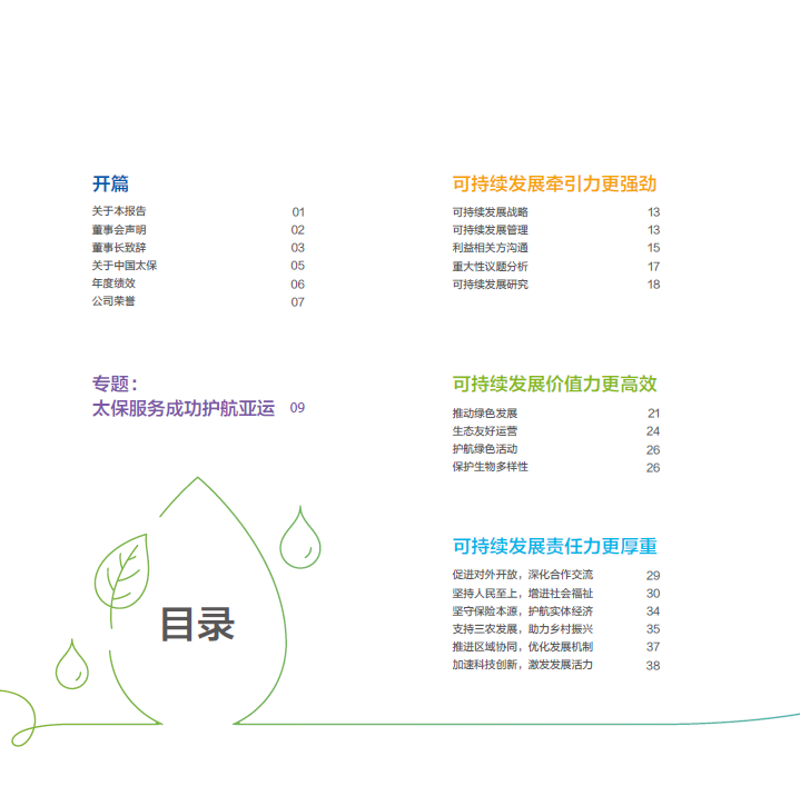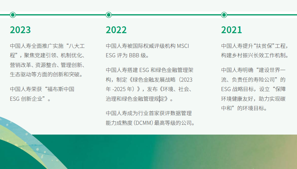 2023 年,中國太保制定《中國太平洋保險(集團(tuán))股份有限公司 2023-2025 年高質(zhì)量發(fā)展規(guī)劃》,將“可持續(xù)發(fā)展能力更強”作為集團(tuán)發(fā)展目標(biāo)之一,將可持續(xù)發(fā)展理念全方位融入公司經(jīng)營,持續(xù)為各利益相關(guān)方創(chuàng)造綜合價值,推動集團(tuán)成為“行業(yè)高質(zhì)量發(fā)展引領(lǐng)者”。