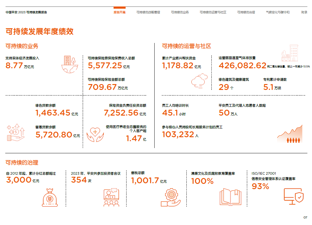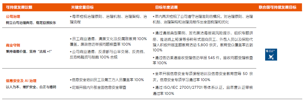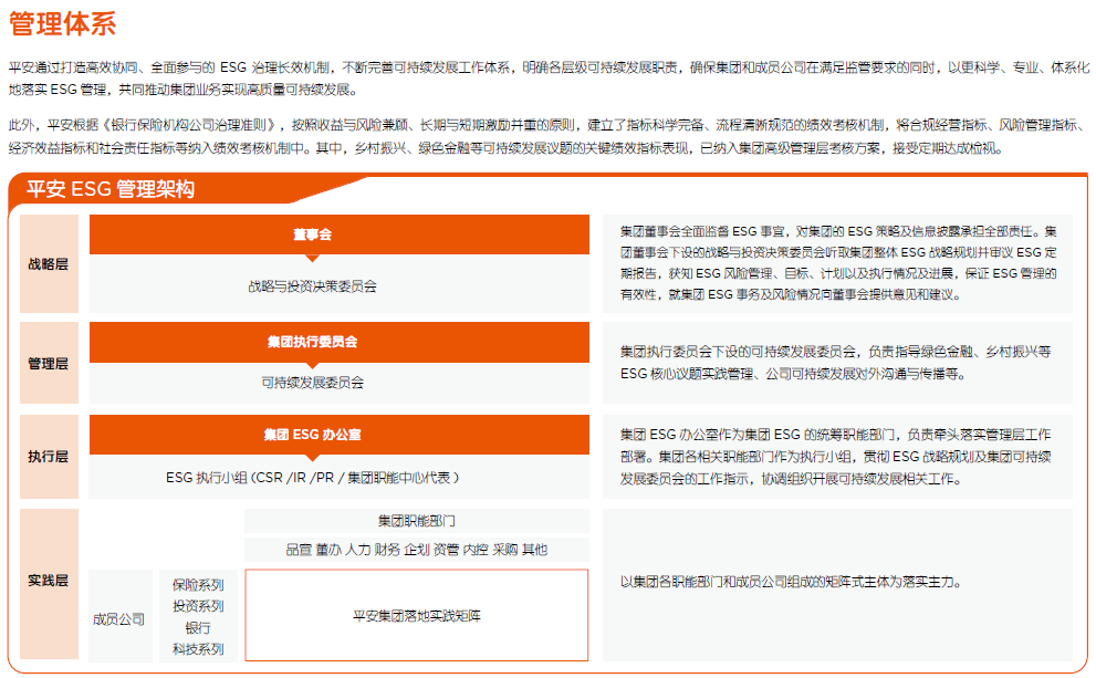 平安每季度追蹤可持續(xù)發(fā)展相關(guān)核心議題的實踐情況,每半年向可持續(xù)發(fā)展委員會、每年度向董事會及其下設(shè)的戰(zhàn)略與投資決策委員會匯報目標(biāo)進(jìn)展情況,確??沙掷m(xù)發(fā)展各項規(guī)劃得到有效落實。