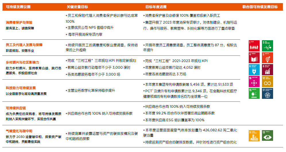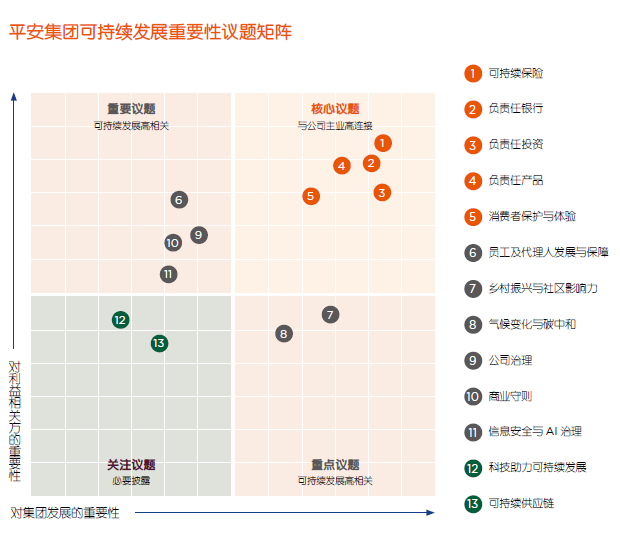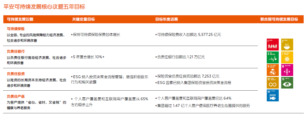 可持續(xù)發(fā)展是平安的發(fā)展戰(zhàn)略,亦是確保公司追求長期價值最大化的基礎(chǔ)。平安核心聚焦公司在ESG 相關(guān)領(lǐng)域的實踐提升,將ESG 要求全面融入集團(tuán)運營管理工作,并定期開展可持續(xù)發(fā)展議題的分析與評估,結(jié)合集團(tuán)發(fā)展目標(biāo)及業(yè)務(wù)目標(biāo),檢視集團(tuán)可持續(xù)發(fā)展規(guī)劃。平安已圍繞13 大可持續(xù)發(fā)展重要議題設(shè)定五年目標(biāo),切實完善可持續(xù)發(fā)展相關(guān)行動和管理,為各項ESG 工作提供行動指南,助力公司實現(xiàn)長期、均衡、高質(zhì)量的可持續(xù)發(fā)展。