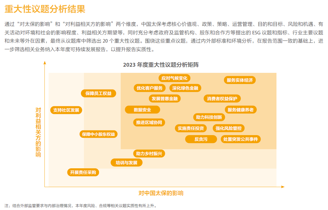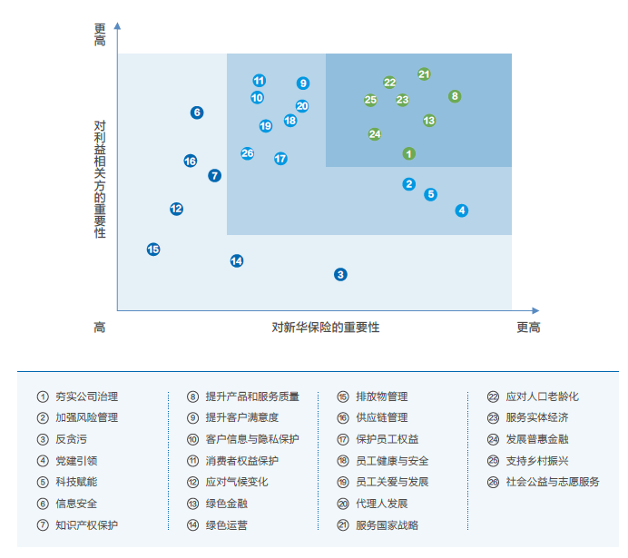 公司對實質(zhì)性議題進(jìn)行回顧和識別,增補重要議題,依據(jù)“對利益相關(guān)方的重要性”和“對新華保險的重要性”兩個維度形成實質(zhì)性議題矩陣。