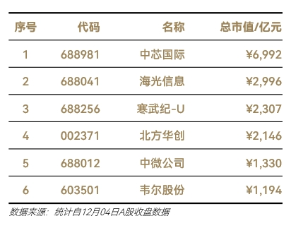 根據(jù)12月04日A股收盤價格估算,中芯國際、海光信息、寒武紀(jì)-U、北方華創(chuàng)、中微公司和韋爾股份市值規(guī)模均破千億元。