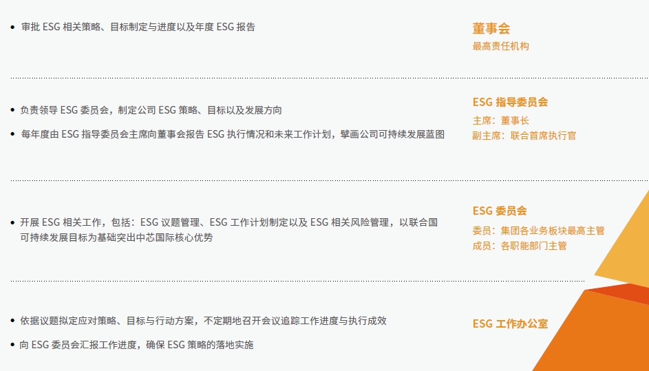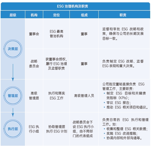 2023 年,公司逐步完善ESG 管理體系和ESG 披露制度,構(gòu)建了包括董事會、戰(zhàn)略委員會、高級管理層、ESG 執(zhí)行小組在內(nèi)的“決策- 管理- 執(zhí)行” 三級 ESG 管理架構(gòu),充分發(fā)揮各層級優(yōu)勢,推動自上而下與自下而上形成合力,全面、系統(tǒng)、有效地落實ESG 戰(zhàn)略。未來公司將不斷探索和完善ESG 管理模式,將ESG 管理與公司的決策、運營與發(fā)展相結(jié)合,持續(xù)創(chuàng)造綜合價值。