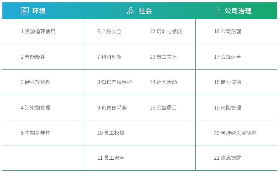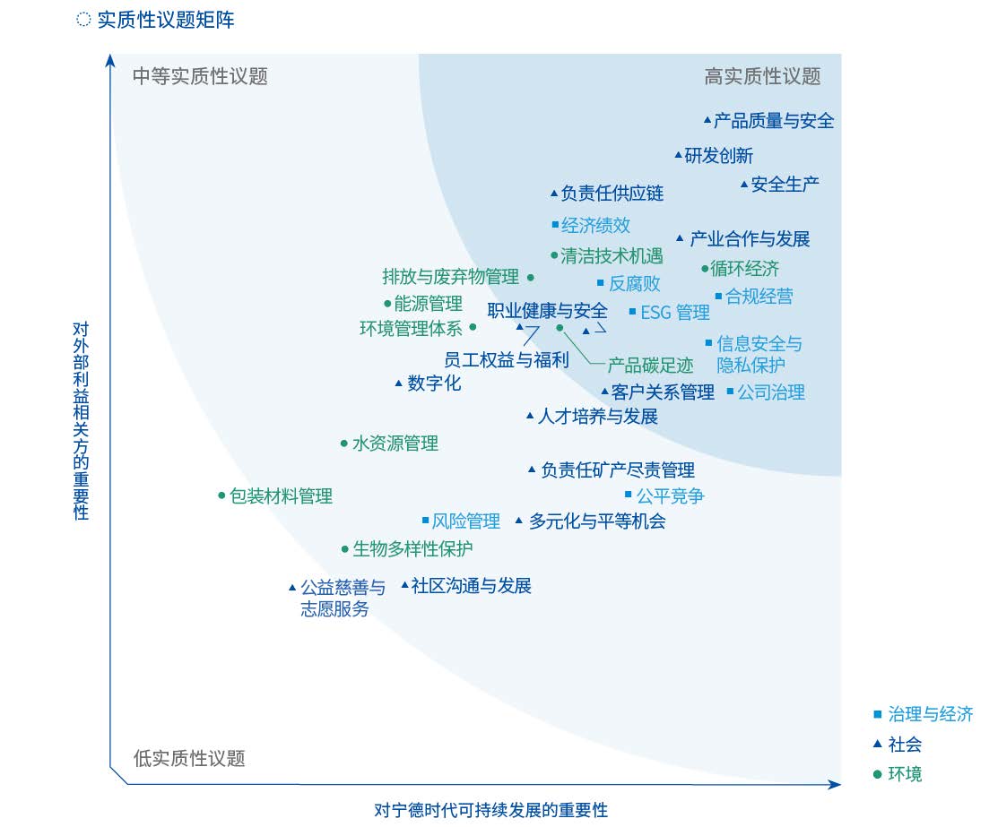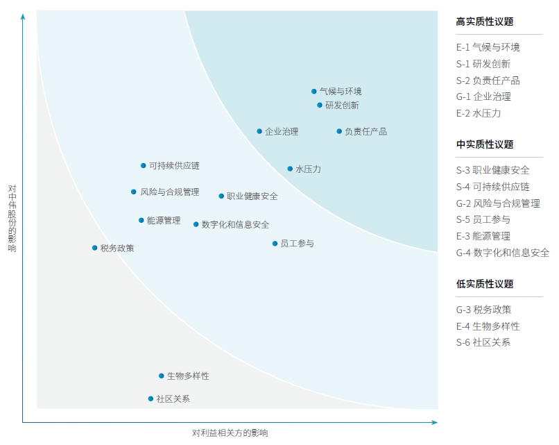 為持續(xù)提升ESG管理水平,欣旺達依據(jù)國家宏觀政策導向、國內(nèi)外社會責任標準研究、利益相關方調(diào)研和公司發(fā)展戰(zhàn)略等維度,綜合識別出對公司和利益相關方均有重要影響的主題和議題,形成實質(zhì)性議題庫。欣旺達最新一次實質(zhì)性議題評估于2023年初完成,已識別的實質(zhì)性議題維持有效,并于本報告中持續(xù)回應相關議題行動與成效。