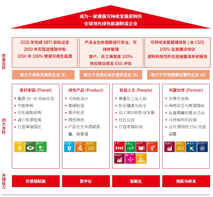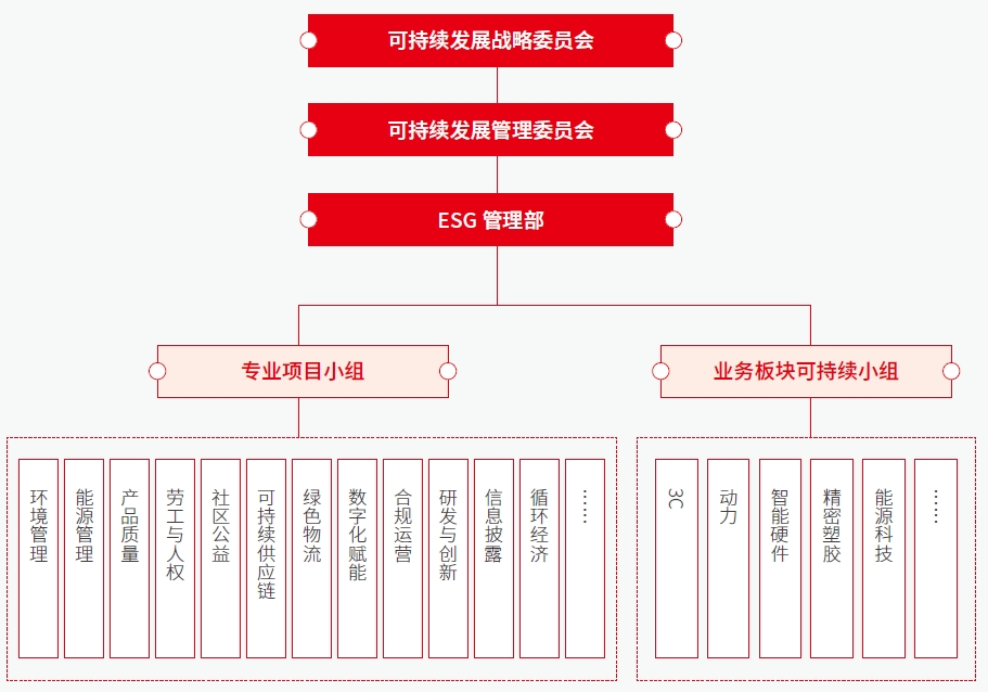 為深刻理解政策趨勢、全面滿足客戶要求、卓越履行社會責任,報告期內(nèi),公司優(yōu)化管理架構,構建可持續(xù)發(fā)展戰(zhàn)略委員會、可持續(xù)發(fā)展管理委員會,并下設專業(yè)項目小組和業(yè)務板塊可持續(xù)小組??沙掷m(xù)發(fā)展戰(zhàn)略委員會由董事長擔任委員會主席,由公司高管擔任委員,共同負責ESG發(fā)展戰(zhàn)略、政策,及整體工作方向,可持續(xù)發(fā)展管理委員會落實可持續(xù)發(fā)展戰(zhàn)略委員會決議,監(jiān)督推動工作小組以具體行動落實ESG事宜,此外開展內(nèi)部培訓、活動及宣傳以建立積極可持續(xù)的文化理念。