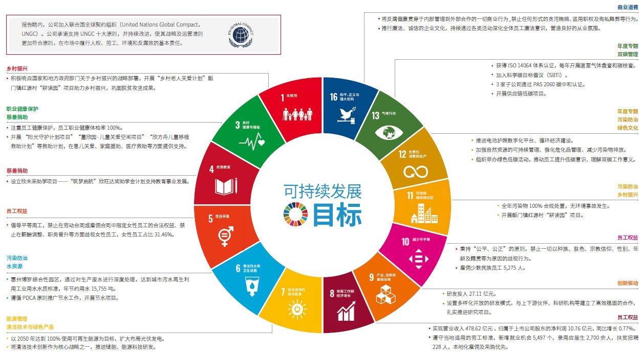 欣旺達全面審視聯(lián)合國可持續(xù)發(fā)展目標(Sustainable Development Goals, SDGs)與公司ESG 管理實踐的關聯(lián)性,運用自身資源與能力,積極響應SDGs。