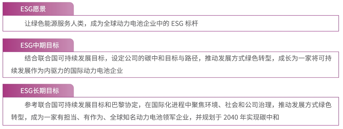 公司秉承“打造最具創(chuàng)造力的鋰電池龍頭企業(yè),為人類可持續(xù)發(fā)展做出突出貢獻”為可持續(xù)發(fā)展愿景,響應全球可持續(xù)發(fā)展目標和利益相關方可持續(xù)發(fā)展需求,有效運營可持續(xù)發(fā)展委員會、可持續(xù)發(fā)展工作聯(lián)席會議以及相關專門委員會等管理組織,致力于將可持續(xù)發(fā)展議題融入到公司各項經(jīng)營管理活動中。