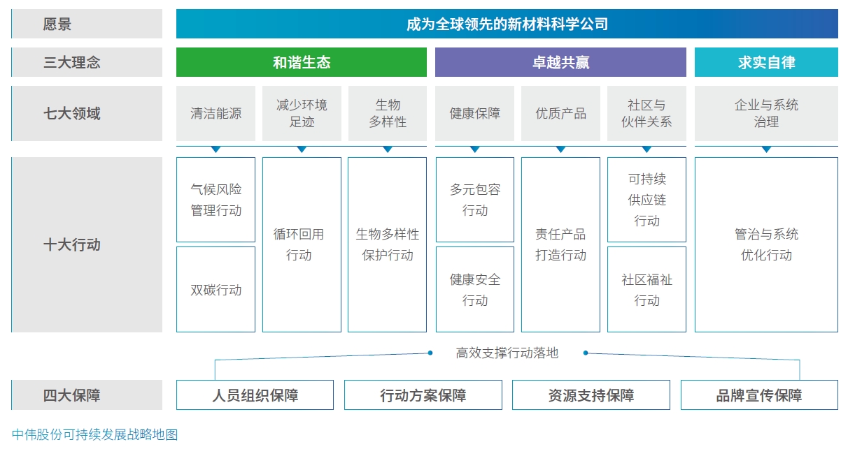 中偉股份以實現(xiàn)“成為全球領先的新材料科學公司”為長期愿景,秉承“和諧生態(tài)、卓越共贏、求實自律”的三大可持續(xù)發(fā)展運營理念,設定“清潔能源、減少環(huán)境足跡、生物多樣性、健康保障、優(yōu)質(zhì)產(chǎn)品、社區(qū)與伙伴關系、企業(yè)與系統(tǒng)治理”的七大重點關鍵領域,部署十大相關行動,構建中偉股份可持續(xù)發(fā)展戰(zhàn)略地圖。