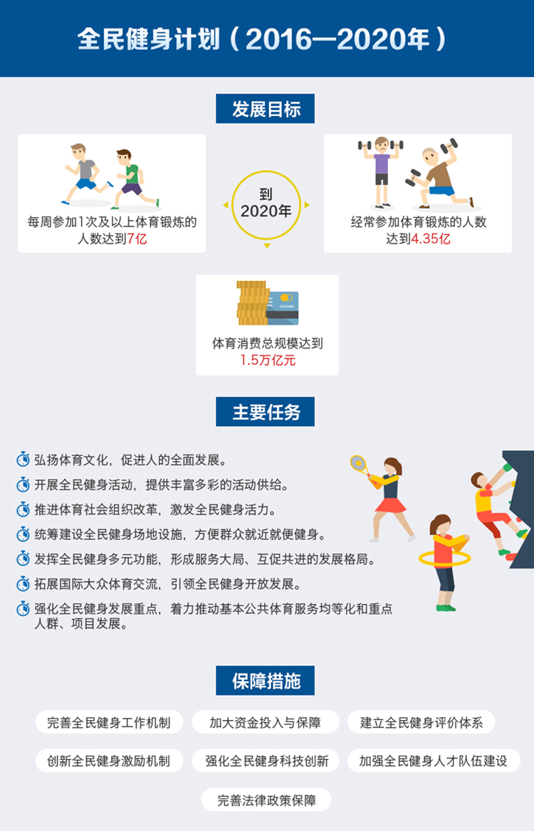 國務院印發(fā)《全民健身計劃(2016—2020年)》,這是“十三五”時期開展全民健身工作的總體規(guī)劃和行動指南?!懊恐軈⒓?次及以上體育鍛煉的人數(shù)達到7億”“人均體育場地面積達到1.8平方米”“體育消費總規(guī)模達到1.5萬億元”……一系列具體目標,勾勒出未來5年全民健身的藍圖。本文從發(fā)展格局、發(fā)展重點、發(fā)展體系3個層面,詳細解析全民健身計劃的豐富內(nèi)涵。