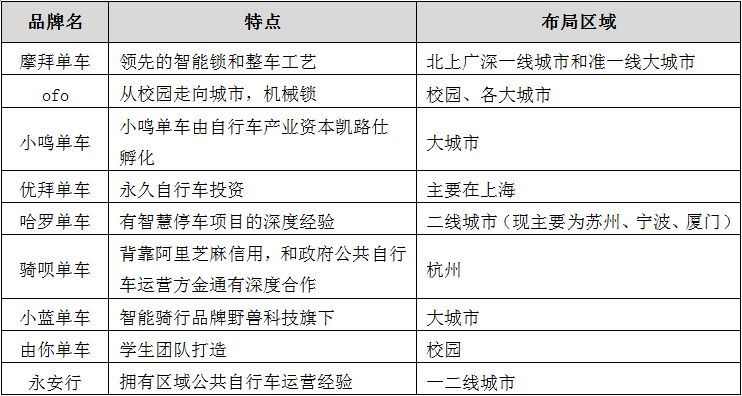圖表1  市面主流的共享單車品牌簡(jiǎn)介