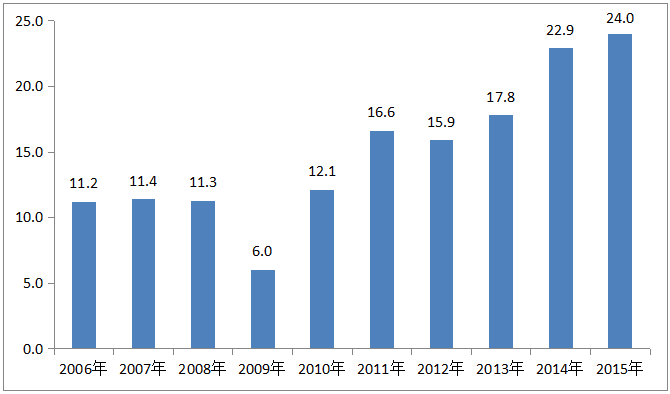 圖表1 2006-2015年全球工業(yè)機(jī)器人銷量(單位:萬臺(tái))
