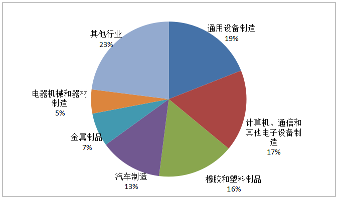 2015年國產(chǎn)工業(yè)機(jī)器人服務(wù)36個(gè)國民經(jīng)濟(jì)行業(yè)大類,87個(gè)國民經(jīng)濟(jì)行業(yè)中類,相較于2013年服務(wù)領(lǐng)域明顯擴(kuò)大。從應(yīng)用行業(yè)看,2015年通用設(shè)備制造業(yè)和電子產(chǎn)品制造業(yè)的銷售量市場占比最高,分別占比為19%和17%。