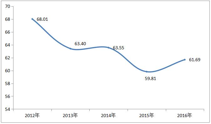 圖表1 2012-2016年中國鋼材實(shí)際消費(fèi)量占產(chǎn)量比重(單位:%)