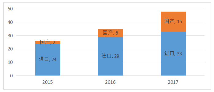 在架空索道方面,近三年來脫掛式架空索道中進口和國產(chǎn)數(shù)量關(guān)系,國產(chǎn)脫掛式架空索道的發(fā)展較快,從2015年的2條增長到2017年的15條。2015-2017年進口占比分別是99.3%、83%、79%。雖然在穩(wěn)步降低,但是進口依賴度總體較高,將近80%。