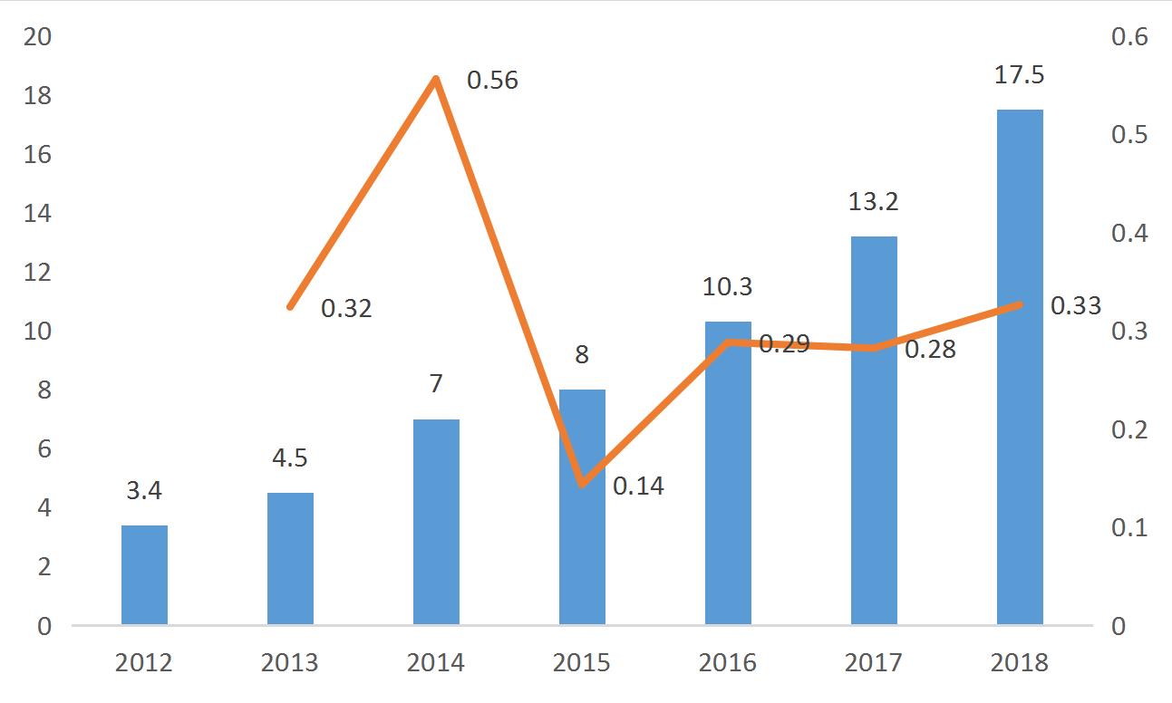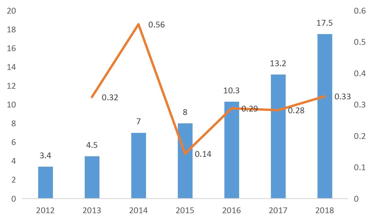 圖表 5   2012-2018年我國服務(wù)機(jī)器人銷售額及增長率(億美元%