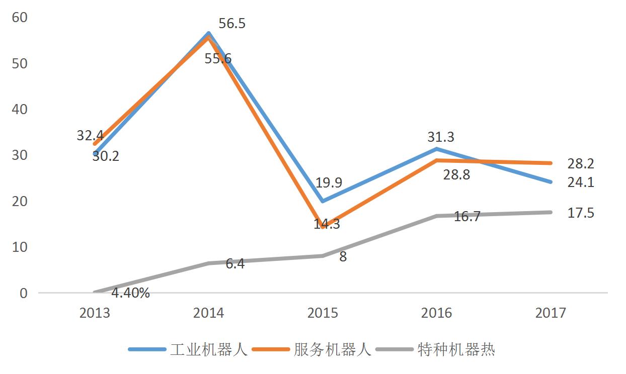 而從三大領(lǐng)域的增長速度來看,從2013-2017年,工業(yè)機(jī)器人和服務(wù)機(jī)器人的年最低增速均在14%以上,2016年開始,工業(yè)機(jī)器人由于市場逐漸飽和,增速開始放緩,服務(wù)機(jī)器人卻保持一路高歌前進(jìn),在2017年增速超過工業(yè)機(jī)器人,未來市場前景一片大好。