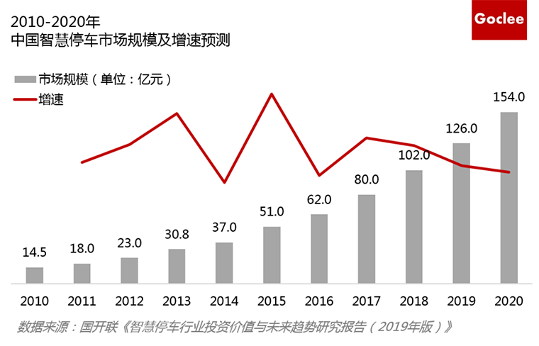 在這種情況下,智慧停車應(yīng)用而生,其影像感測、汽車識別技術(shù)和大數(shù)據(jù)技術(shù)的不斷提升能夠幫助車主快速找到停車位,并簡化停車流程、提升車位利用率,成為當(dāng)下解決停車難的最好方案,同時(shí)也催生了巨大的市場。根據(jù)國開聯(lián)《智慧停車行業(yè)投資價(jià)值與未來趨勢研究報(bào)告(2019年版)》,2010年我國智慧停車市場規(guī)模僅為14.5億元,截止到2017年我國智慧停車市場規(guī)模達(dá)到了80億元,預(yù)計(jì)2018年我國智慧停車市場規(guī)模將突破100億元。未來幾年,市場規(guī)模以20%左右的速度繼續(xù)增加,并且預(yù)測到了2020我國智慧停車市場規(guī)模將達(dá)到154億元。