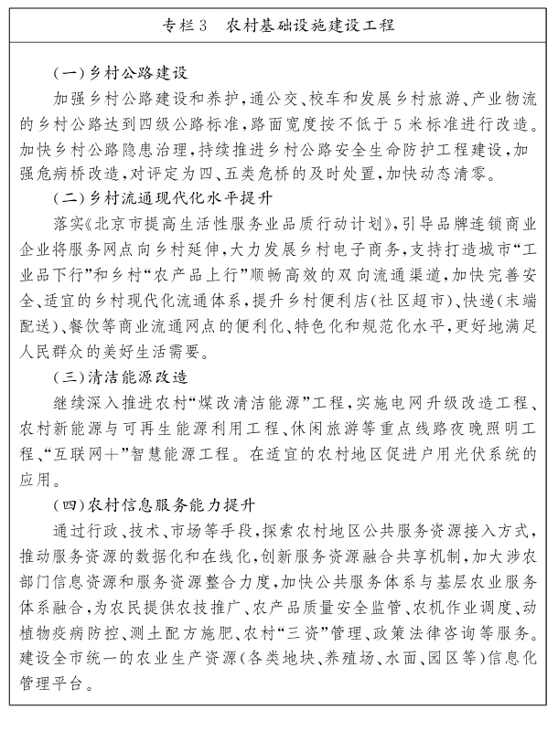 適應(yīng)農(nóng)村經(jīng)濟(jì)社會(huì)發(fā)展需要,進(jìn)一步規(guī)范完善農(nóng)村基本服務(wù)設(shè)施、交通物流設(shè)施、“煤改清潔能源”工程、信息化設(shè)施建設(shè),加快推進(jìn)“四好農(nóng)村路”建設(shè),推動(dòng)城鄉(xiāng)基礎(chǔ)設(shè)施共建共享、互聯(lián)互通。