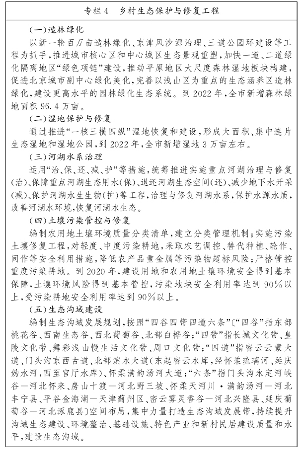 完善生態(tài)、文化保護(hù)格局。順應(yīng)鄉(xiāng)村功能由農(nóng)業(yè)和居住功能向生態(tài)、宜居、休閑、文化等多功能拓展趨勢(shì),重點(diǎn)加強(qiáng)生態(tài)、文化格局構(gòu)建。堅(jiān)持山水林田湖草系統(tǒng)治理,山區(qū)、平原統(tǒng)籌規(guī)劃,城鎮(zhèn)、鄉(xiāng)村相互溝通,構(gòu)建多類型、多層次、多功能、成網(wǎng)絡(luò)的“一屏、三環(huán)、五河、九楔”(“一屏”為山區(qū)生態(tài)屏障;“三環(huán)”為一道綠隔城市公園環(huán)、二道綠隔郊野公園環(huán)、環(huán)首都森林濕地公園環(huán);“五河”為永定河、潮白河、北運(yùn)河、拒馬河、泃河為主構(gòu)成的河湖水系;“九楔”為九條連接中心城區(qū)、新城及跨界城市組團(tuán)的楔形生態(tài)空間)高質(zhì)量綠色空間體系,筑牢鄉(xiāng)村發(fā)展的綠色基底。加強(qiáng)鄉(xiāng)村歷史文化和農(nóng)業(yè)遺產(chǎn)保護(hù)與傳承,依托大運(yùn)河、長(zhǎng)城、西山永定河三大文化帶,建設(shè)具有平原特色、淺山特色與深山特色的三類風(fēng)貌區(qū),構(gòu)建全覆蓋、更完善的城鄉(xiāng)歷史文化保護(hù)體系。