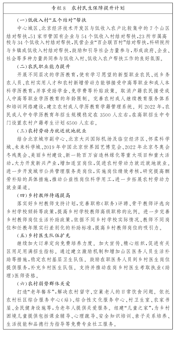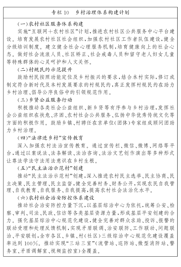 推進(jìn)平安鄉(xiāng)村建設(shè)。健全落實(shí)社會(huì)治安綜合治理領(lǐng)導(dǎo)責(zé)任制,大力推進(jìn)農(nóng)村社會(huì)治安防控體系建設(shè),推動(dòng)社會(huì)治安防控力量下沉。深入開展掃黑除惡專項(xiàng)斗爭(zhēng),嚴(yán)厲打擊農(nóng)村黑惡勢(shì)力,堅(jiān)決做到有黑必掃、有惡必除、有“傘”必打、有腐必反、有亂必治、除惡務(wù)盡。嚴(yán)厲打擊黃賭毒盜拐騙等違法犯罪行為。加強(qiáng)無神論宣傳教育,抵制封建迷信活動(dòng)。依法加大對(duì)農(nóng)村非法宗教、邪教活動(dòng)打擊力度,嚴(yán)防境外滲透,繼續(xù)整治農(nóng)村亂建宗教活動(dòng)場(chǎng)所、濫塑宗教造像行為。健全農(nóng)村公共安全體系。完善區(qū)、鄉(xiāng)鎮(zhèn)、村(社區(qū))三級(jí)綜治中心功能和運(yùn)行機(jī)制。加快推進(jìn)城市管理網(wǎng)、社會(huì)服務(wù)管理網(wǎng)、社會(huì)治安網(wǎng)、城管綜合執(zhí)法網(wǎng)等“多網(wǎng)”融合發(fā)展,實(shí)現(xiàn)區(qū)、鄉(xiāng)鎮(zhèn)、村(社區(qū))三級(jí)在信息系統(tǒng)、基礎(chǔ)數(shù)據(jù)等方面的深度融合、一體化運(yùn)行。加強(qiáng)街鄉(xiāng)網(wǎng)格化綜合信息平臺(tái)建設(shè),強(qiáng)化綜合統(tǒng)籌職能,逐步實(shí)現(xiàn)“五有”(有綜合平臺(tái)、有基礎(chǔ)數(shù)據(jù)、有網(wǎng)格地圖、有專職隊(duì)伍、有工作機(jī)制)治理新格局。繼續(xù)深化“一村一警”建設(shè),加強(qiáng)農(nóng)村派出所警力保障。強(qiáng)化群防群治,推廣“市民勸導(dǎo)隊(duì)”“流動(dòng)人口服務(wù)管理自治協(xié)會(huì)”“村民區(qū)域聯(lián)防”等工作模式。積極開展安全生產(chǎn)宣傳進(jìn)農(nóng)村活動(dòng),堅(jiān)決遏制重特大安全事故。健全矛盾糾紛多元化解機(jī)制,提升農(nóng)村基層矛盾預(yù)防化解能力。完善利益表達(dá)機(jī)制。建立黨代表、人大代表、政協(xié)委員聯(lián)系農(nóng)村基層制度,完善黨員干部直接聯(lián)系村民制度,引導(dǎo)村民理性合法表達(dá)利益訴求,做到小事不出村、大事不出鄉(xiāng)(鎮(zhèn))。落實(shí)鄉(xiāng)鎮(zhèn)政府農(nóng)村道路交通安全監(jiān)督管理責(zé)任,探索實(shí)施“路長(zhǎng)制”。推進(jìn)農(nóng)村“雪亮工程”建設(shè)。到2020年,掃黑除惡專項(xiàng)斗爭(zhēng)取得顯著成效,推動(dòng)形成標(biāo)本兼治、正本清源的社會(huì)治理新格局,為首都發(fā)展創(chuàng)造良好的社會(huì)環(huán)境。