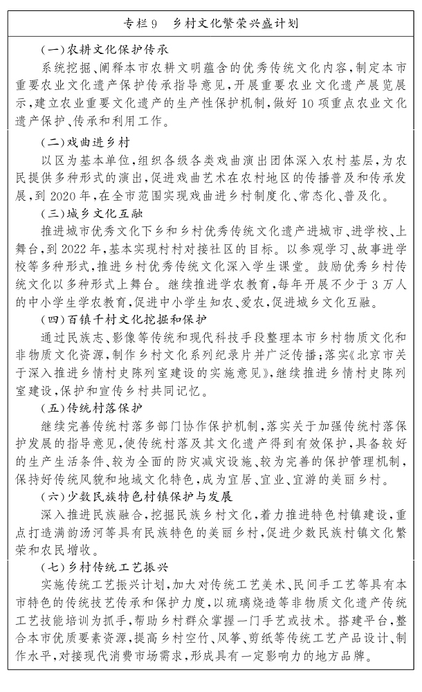 保護(hù)和利用鄉(xiāng)村傳統(tǒng)文化。結(jié)合弘揚(yáng)中國(guó)傳統(tǒng)節(jié) 日文化,開展農(nóng)耕文化傳承保護(hù)工程,深入挖掘農(nóng)業(yè)文化遺產(chǎn)資源中蘊(yùn)含的優(yōu)秀思想觀念、人文精神、道德規(guī)范,充分發(fā)揮其在凝聚人心、鄰里互助、教化群眾、淳化民風(fēng)中的重要作用。加強(qiáng)對(duì)鄉(xiāng)村中蘊(yùn)含的傳統(tǒng)歷法、農(nóng)事節(jié) 氣、民間習(xí)俗、民族節(jié) 慶、鄉(xiāng)土手藝、地方餐飲等非物質(zhì)文化遺產(chǎn)的研究闡釋,促進(jìn)活態(tài)利用,推動(dòng)優(yōu)秀農(nóng)耕文化融入現(xiàn)代生產(chǎn)生活,培育和扶植符合現(xiàn)代需求、飽含京韻、體現(xiàn)“農(nóng)味”的鄉(xiāng)村傳統(tǒng)文化。加強(qiáng)鄉(xiāng)村革命文化遺產(chǎn)的保護(hù)與傳承。完善農(nóng)業(yè)文化遺產(chǎn)名錄,加強(qiáng)動(dòng)態(tài)傳承、開發(fā)、保護(hù)與利用。完善農(nóng)村非物質(zhì)文化遺產(chǎn)代表性項(xiàng)目及代表性傳承人名錄體系,建立健全保護(hù)、傳承、監(jiān)督檢查機(jī)制,創(chuàng)建民間文化藝術(shù)之鄉(xiāng),促進(jìn)活態(tài)傳承。在條件具備的鄉(xiāng)鎮(zhèn)(街道)、行政村(社區(qū)),加大鄉(xiāng)村(社區(qū))綜合文化室建設(shè)力度。開展鄉(xiāng)村史志修編,傳承鄉(xiāng)村共同記憶。加強(qiáng)京津冀三地鄉(xiāng)村歷史文化遺產(chǎn)的交流互鑒,共同培育具有京津冀特色的鄉(xiāng)村文化品牌。