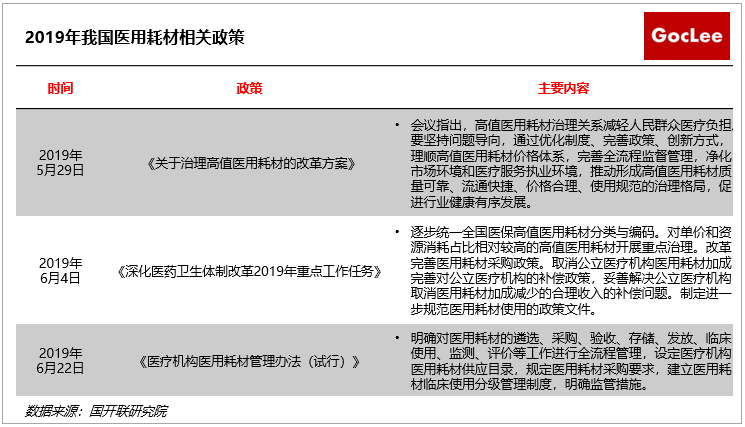 為整治上述問題,2019年5-6月國家陸續(xù)出臺(tái)《關(guān)于治理高值醫(yī)用耗材的改革方案》、《深化醫(yī)療衛(wèi)生體制改革2019年重點(diǎn)工作任務(wù)》和《醫(yī)療機(jī)構(gòu)醫(yī)用耗材管理辦法(試行)》三項(xiàng)政策針對醫(yī)療耗材進(jìn)行整治,主要通過藥品耗材聯(lián)合帶量采購、取消醫(yī)用耗材加成、降低檢查檢驗(yàn)費(fèi)用等綜合措施,進(jìn)一步規(guī)范調(diào)整醫(yī)療服務(wù)項(xiàng)目價(jià)格,改善醫(yī)療服務(wù)。