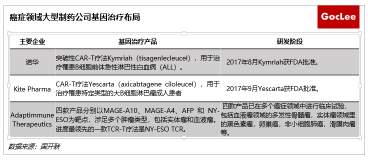 當(dāng)前越來越多的大型制藥公司正在通過并購、或與基因療法藥企深度合作的方式擴大或引入自身在基因治療的業(yè)務(wù)板塊,罕見病、癌癥成為基因治療的重要應(yīng)用領(lǐng)域,未來應(yīng)用前景廣闊。在罕見病應(yīng)用領(lǐng)域,諾華、Nightstar  Therapeutics針對視網(wǎng)膜病變等研發(fā)出新產(chǎn)品,目前正處于臨床試驗階段;Voyager Therapeutics專注于神經(jīng)系統(tǒng)疾病研發(fā)出新療法;Orchard  Therapeutics、BioMarin Pharmaceutical等聚焦于血液病和遺傳性代謝??;在癌癥應(yīng)用領(lǐng)域,諾華、Kite Pharma、Adaptimmune Therapeutics等致力于血液瘤和實體瘤等應(yīng)用領(lǐng)域取得基因療法新突破。