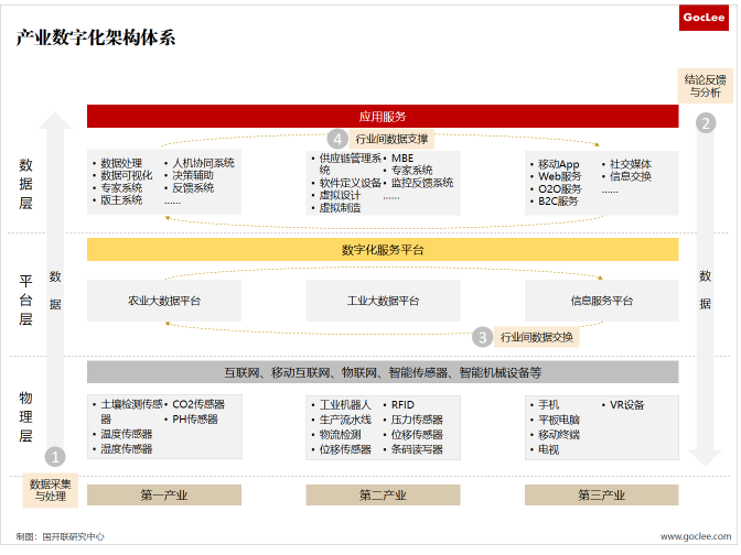 產(chǎn)業(yè)數(shù)字化的整體構(gòu)架分為三個(gè)層次,分別是物理層,平臺(tái)層和數(shù)據(jù)層,物理層有傳感器、智能硬件和部分軟件組成,主要負(fù)責(zé)數(shù)據(jù)的傳輸和生產(chǎn)執(zhí)行,實(shí)現(xiàn)與平臺(tái)層的信息互聯(lián);平臺(tái)層主要大數(shù)據(jù)平臺(tái)和云計(jì)算平臺(tái)組成,負(fù)責(zé)提供數(shù)據(jù)的存儲(chǔ)和計(jì)算;數(shù)據(jù)層有數(shù)據(jù)匯集而成,通過(guò)不同行業(yè)間的數(shù)據(jù)互相支撐,提供多樣化的應(yīng)用服務(wù)。