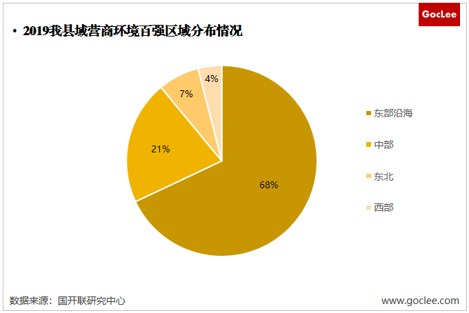 我國縣域的營商環(huán)境受區(qū)域經(jīng)濟影響較大,總體上縣域營商環(huán)境的也與我國區(qū)域經(jīng)濟發(fā)展情況相似,呈現(xiàn)東強西弱的發(fā)展態(tài)勢區(qū)域不平衡的發(fā)展情況較為明顯。根據(jù)國家工信部2019年我國縣域營商環(huán)境百強中,東部沿海地區(qū)憑借深厚的產(chǎn)業(yè)經(jīng)濟基礎(chǔ)和豐富的要素資源有68個縣區(qū)躋身我國縣域營商環(huán)境百強,區(qū)域先發(fā)優(yōu)勢明顯;中部以21個縣區(qū)位列第二東北和西部分別以7個縣區(qū)和4個縣區(qū)位列第三和第四,這兩個區(qū)域的縣域營商環(huán)境亟待改善。