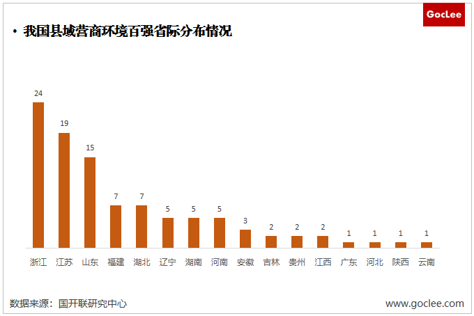 從省際分布情況來看,浙江、江蘇、山東分別以24個縣區(qū)、19個縣區(qū)和15個縣區(qū)位列前三強,在全國省市中遙遙領(lǐng)先,占據(jù)我國縣域營商環(huán)境百強的50%以上;中部地區(qū)縣域營商環(huán)境表現(xiàn)突出,在縣域營商環(huán)境百強中,湖北、湖南、河南分別占據(jù)7席5、5席和3席隨著中部產(chǎn)業(yè)經(jīng)濟的崛起和營商環(huán)境的優(yōu)化,中部地區(qū)縣域營商環(huán)境水平直追東部地區(qū);西部地區(qū)僅陜西和云南入圍。