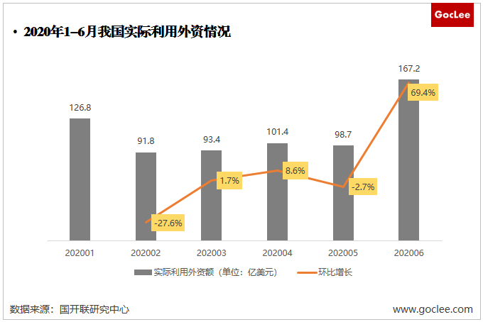 從單月增長(zhǎng)情況來(lái)看,我國(guó)外商投資情況逐步復(fù)蘇,每月實(shí)際利用外資呈現(xiàn)上升趨勢(shì),2020年6月當(dāng)月我國(guó)實(shí)際利用外資達(dá)167.2億美元,相較5月增長(zhǎng)了69.4%。外商投資與其和信心穩(wěn)定趨好。