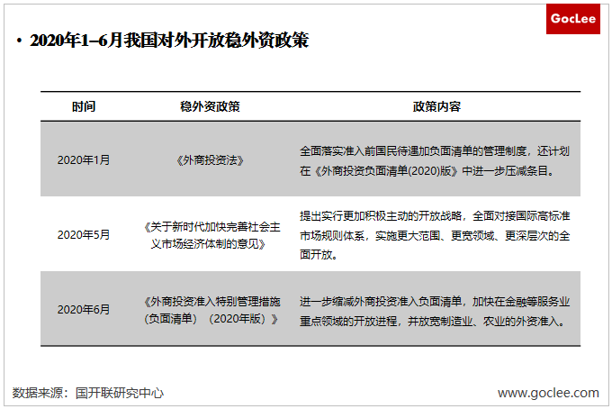 疫情并未阻擋我國(guó)持續(xù)推進(jìn)對(duì)外開(kāi)放的步伐,在國(guó)家層面的戰(zhàn)略部署上,今年的國(guó)務(wù)院政府工作報(bào)告中,已如何促進(jìn)外貿(mào)基本穩(wěn)定、積極利用外資、高質(zhì)量共建“一帶一路”、推動(dòng)貿(mào)易和投資自由化便利化等進(jìn)行了詳細(xì)地部署。正穩(wěn)外資的措施上,我國(guó)陸續(xù)出臺(tái)多項(xiàng)政策擴(kuò)大對(duì)外開(kāi)放,從1月《外商投資法》正式出臺(tái),到《關(guān)于新時(shí)代加快完善社會(huì)主義市場(chǎng)經(jīng)濟(jì)體制的意見(jiàn)》、《外商投資負(fù)面清單(2020)》等政策的落地,我國(guó)不斷實(shí)施更大范圍、更寬領(lǐng)域、更深層次的全面開(kāi)放。