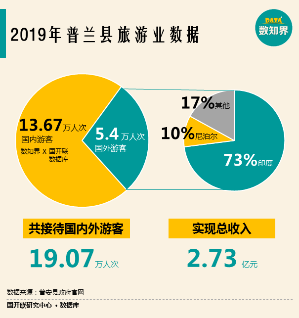 獨特的宗教意義和民俗文化也為普蘭帶來了大量的海內(nèi)外游客、教徒。也因此,旅游業(yè)成為了普蘭的支柱產(chǎn)業(yè)之一。2019年,普蘭縣共接待國內(nèi)外游客19.07萬人次,其中國內(nèi)游客13.67萬人次,國外游客5.4萬人次,實現(xiàn)總收入2.73億元。從客源地來講,國外游客中印度人占73%,尼泊爾人占10%。
