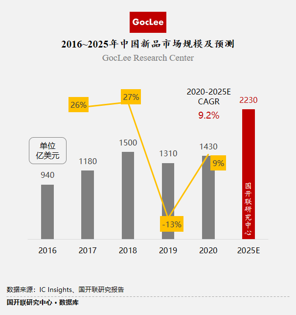 全球半導(dǎo)體市場強(qiáng)勁復(fù)蘇,中國連續(xù)多年成全球最大半導(dǎo)體消費(fèi)市場。根據(jù)國開聯(lián)研究中心報告顯示,預(yù)計到2025年,我國半導(dǎo)體芯片市場規(guī)模將達(dá)到2230億美元,五年復(fù)合增長率達(dá)到9.2%。