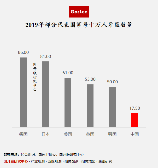 我國口腔醫(yī)療資源長期存在供給不足的現象。以口腔醫(yī)師數量為例,據相關統(tǒng)計數據,2019年我國每十萬人口牙醫(yī)數量僅17.5人,遠低于歐美日韓等發(fā)達國家水平。截至2019年底全國口腔執(zhí)業(yè)(助理)醫(yī)師約為24.5萬人。國開聯研究中心參照上述發(fā)達國家和地區(qū)數據測算發(fā)現,現階段我國牙醫(yī)缺口數量在45-90萬人左右,是現有牙醫(yī)人數的1.83-3.67倍。