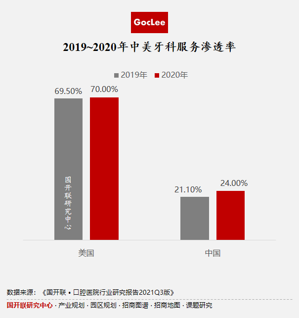 口腔醫(yī)療消費市場已成近年來比較火熱的賽道之一,《國開聯 · 口腔醫(yī)院行業(yè)研究報告2021Q3版》數據顯示,2016-2020年我國口腔醫(yī)療服務市場規(guī)模從855億元增長至1199億元,年復合增長率達到8.82%,預計2021年有望達到1450億元。不過在市場規(guī)模高速增長的背后,我國口腔醫(yī)療消費滲透率對比發(fā)達國家和地區(qū)仍處于較低水平,2020年我國牙科服務普及率僅為24.0%,顯著低于美國的70%。