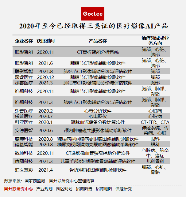 《國(guó)開(kāi)聯(lián) -第三方醫(yī)學(xué)影像中心行業(yè)報(bào)告2021》數(shù)據(jù)顯示,2020年前尚無(wú)醫(yī)學(xué)影像AI產(chǎn)品取得三類證,但是從2020年至今,已有11家企業(yè)的16款醫(yī)學(xué)影像AI產(chǎn)品取得三類證,其中不少產(chǎn)品的應(yīng)用治療領(lǐng)域開(kāi)始從肺結(jié)節(jié)和糖網(wǎng)病變向心腦血管、神經(jīng)系統(tǒng)、骨骼甚至腫瘤等多個(gè)病種滲透,標(biāo)志著醫(yī)療影像AI產(chǎn)品開(kāi)始多元化: