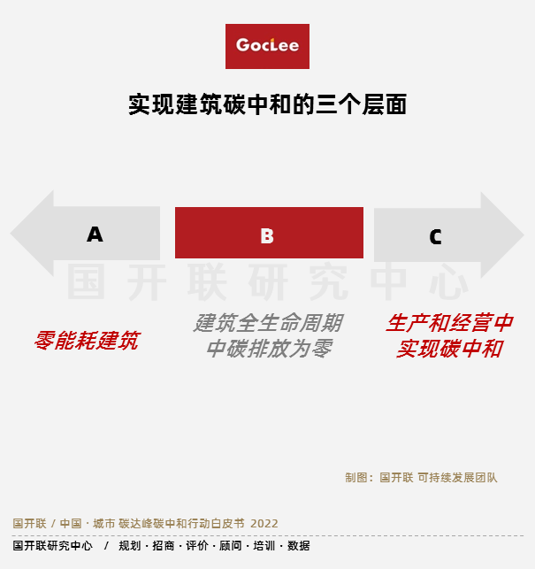 中國實現(xiàn)建筑碳中和主要有三個層面:第一,零能耗建筑。并非指建筑不耗能,二是通過節(jié)能減排、負(fù)碳技術(shù)等手段降低或抵消運營碳排放;第二,建筑全生命周期中碳排放為零。即整個建筑全生命周期中,每個階段都會有溫室氣體排放,為了整個生命周期的碳中和需要分析每一個階段的碳足跡和抵消方法;第三,建筑業(yè)參與者,在各個企業(yè)或組織的生產(chǎn)和經(jīng)營中實現(xiàn)碳中和的過程。